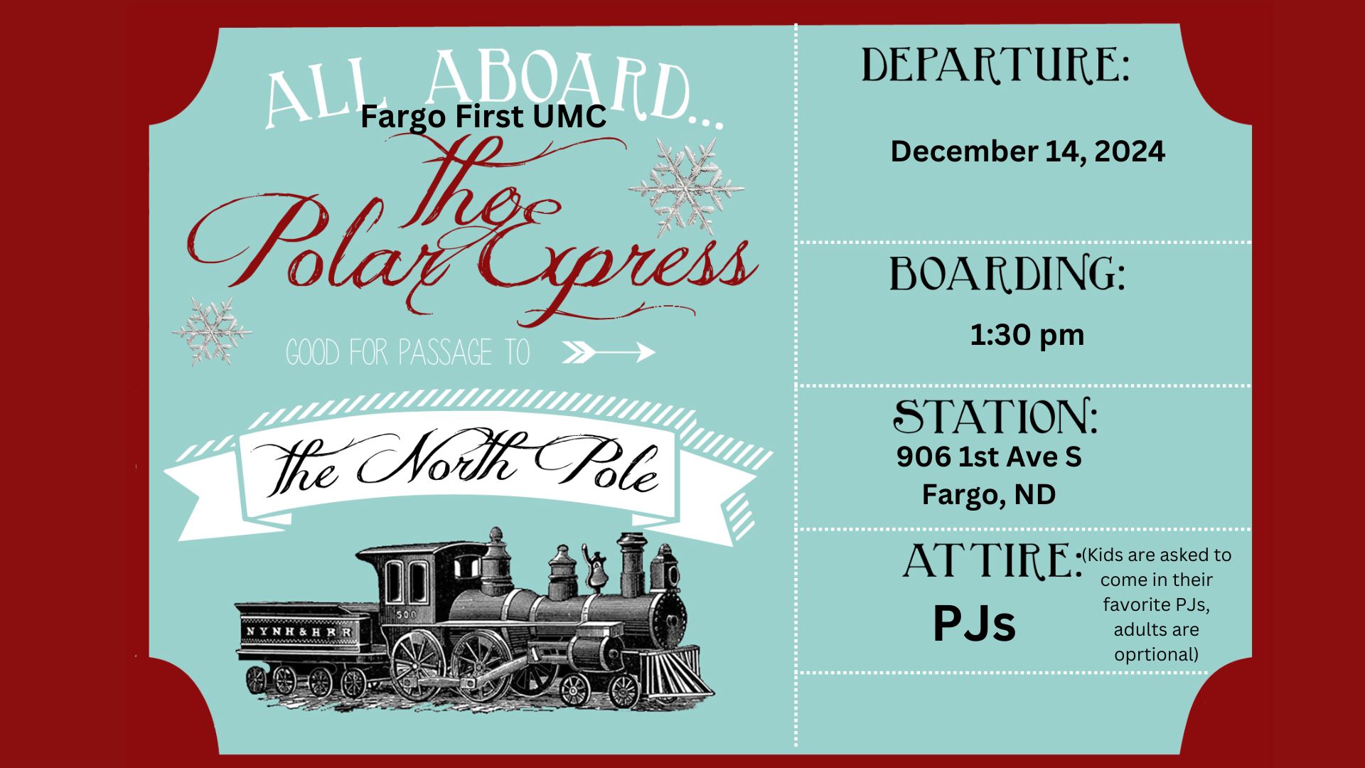 Join us for an afternoon of fun as we board the Polar Express. We will travel to the North Pole for an afternoon of fun through, crafts, cookies, the sharing of the Polar Express story and we will look at Mark 5:36.